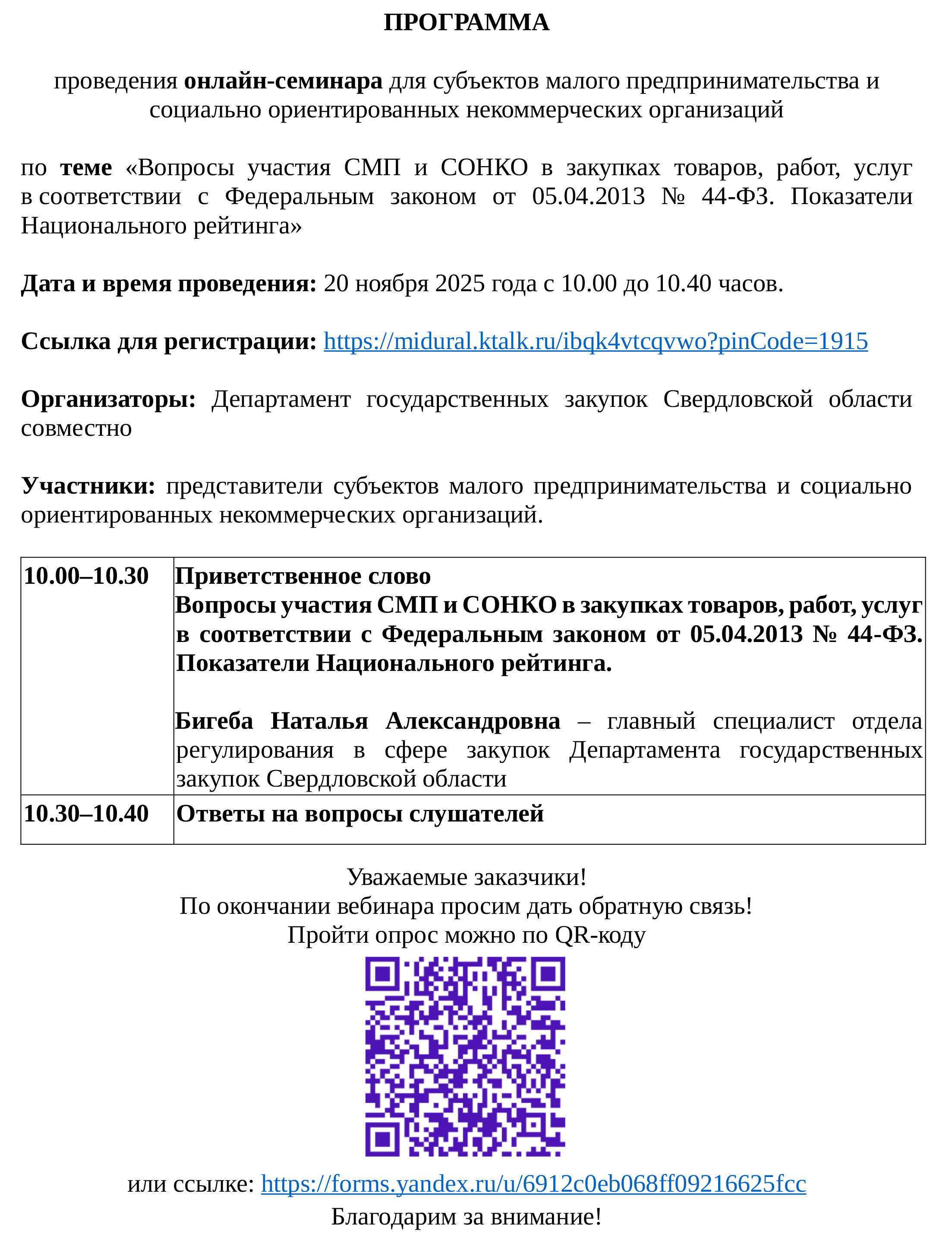 Для вас 20 ноября 2025 года с 10:00 до 10:40 часов Департамент государственных закупок Свердловской области проводит бесплатный онлайн семинар по теме: «Вопросы участия СМП и СОНКО в закупках товаров, работ, услуг в соответствии с Федеральным законом от 05.04.2013 № 44-ФЗ. Показатели Национального рейтинга».